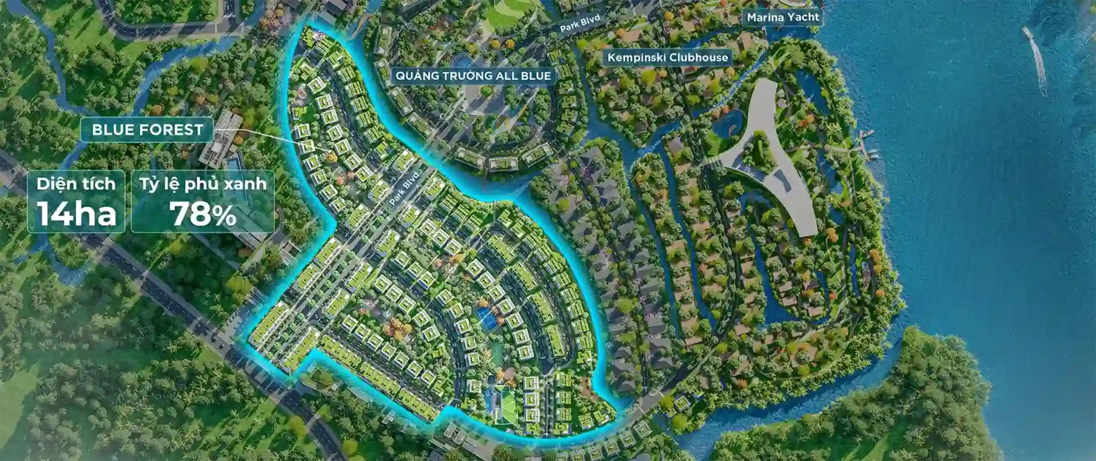 Phân khu Blue Forest có quy mô 14ha, trong đó 11ha được chủ đầu tư phụ xanh bằng 7 tầng cây xanh, tỷ lệ phủ xanh đến 78%. Một phân khu độc đáo với nhà ngay giữa rừng, bao quanh là kênh đào cực kỳ thoáng mát. Phân khu có lợi thế nằm trục chính 28m vào dự án, nên những căn shophouse mặt tiền rất phù hợp để kinh doanh buôn bán.
